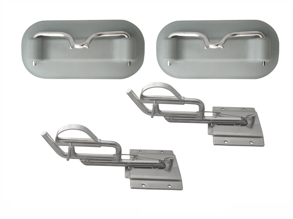 Rockboat heavy duty vertical snap davits are used for attaching your inflatable boat to the swim platform which makes it easier and safer, to both mount the outboard motor and also to board the inflatable. The grey rubber pads glue onto the inflatable and the brackets bolt onto the platform. When ready to get underway you simply unhinge it from the davit head and you are free. When returning simply hinge the inflatable back on and the boat can now be swung up out of the water for transport.