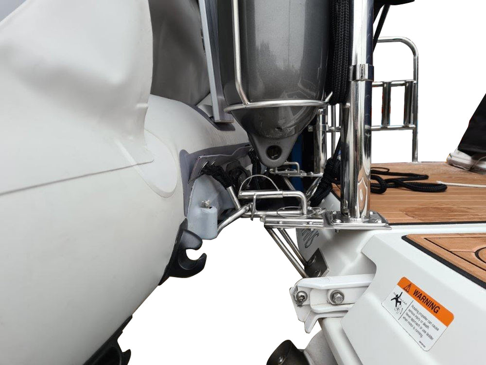 Rockboat heavy duty snap davits are used for attaching your inflatable boat to the swim platform which makes it easier and safer, to both mount the outboard motor and also to board the inflatable. The grey rubber pads glue onto the inflatable and the brackets bolt onto the platform. When ready to get underway you simply unhinge it from the davit head and you are free. When returning simply hinge the inflatable back on and the boat can now be swung up out of the water for transport.